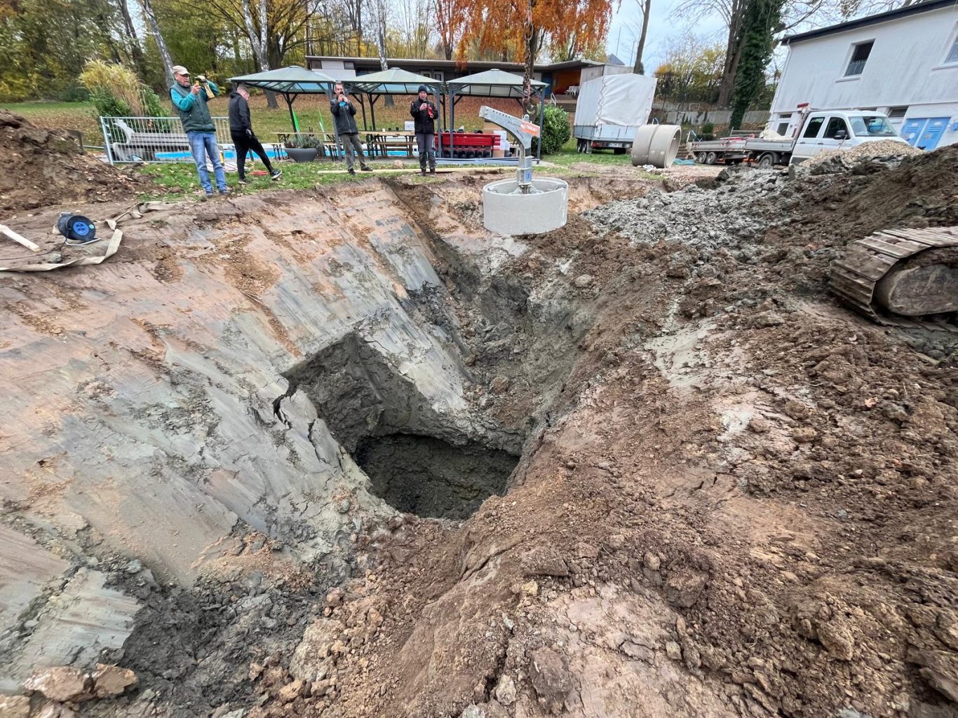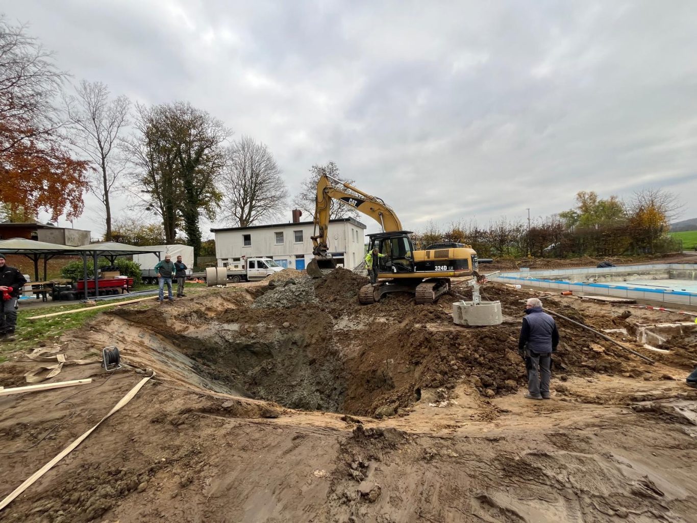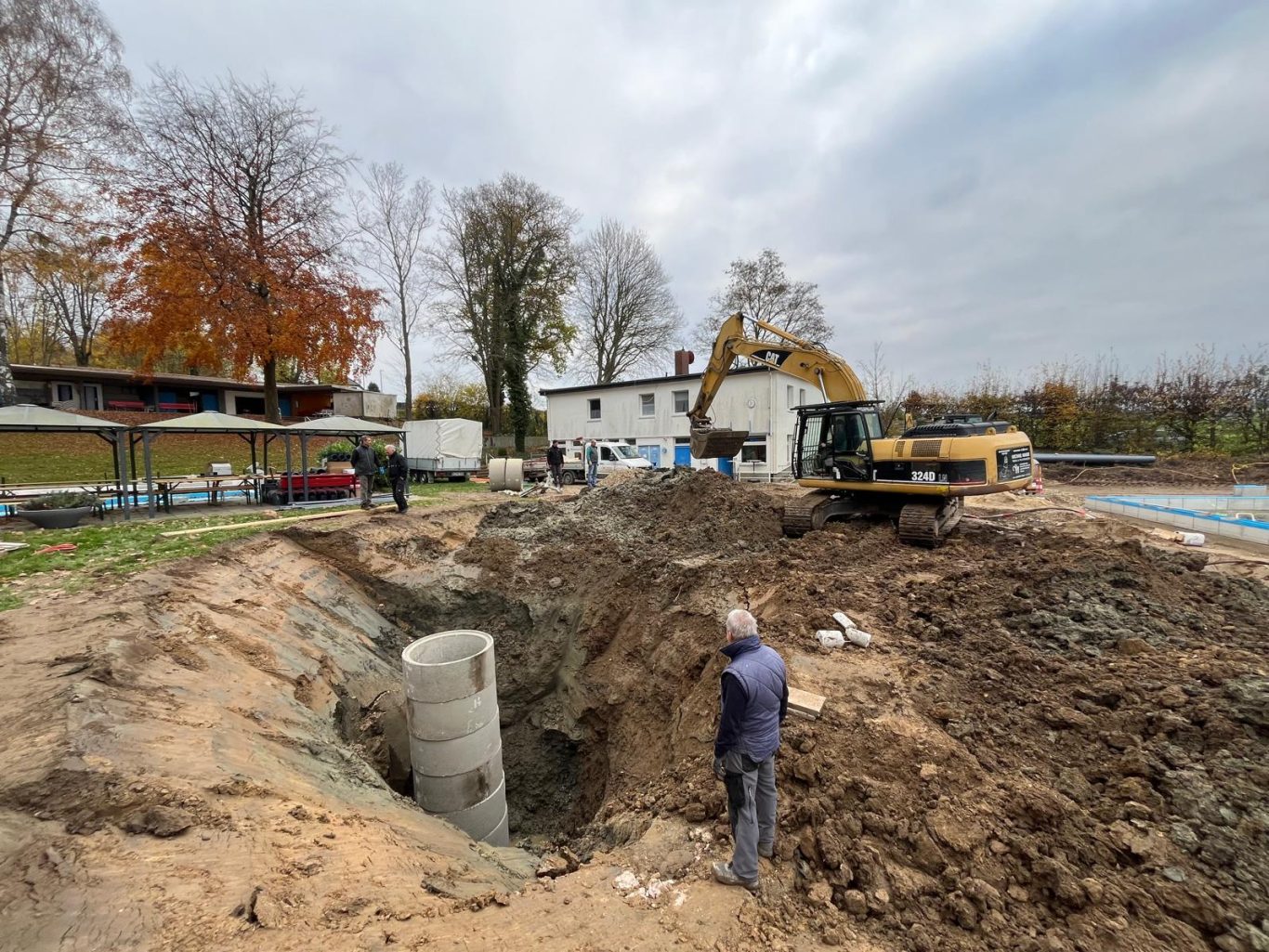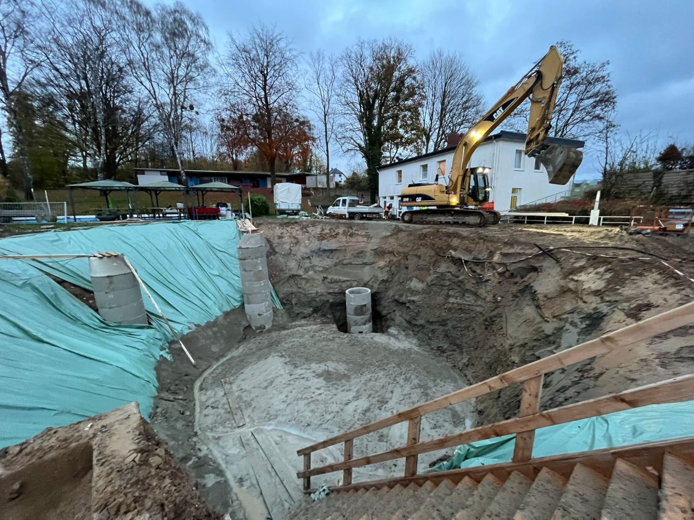 Die Erdarbeiten sind schon fast fertig und die Schächte zur Grundwasserabsenkung sind gesetzt.