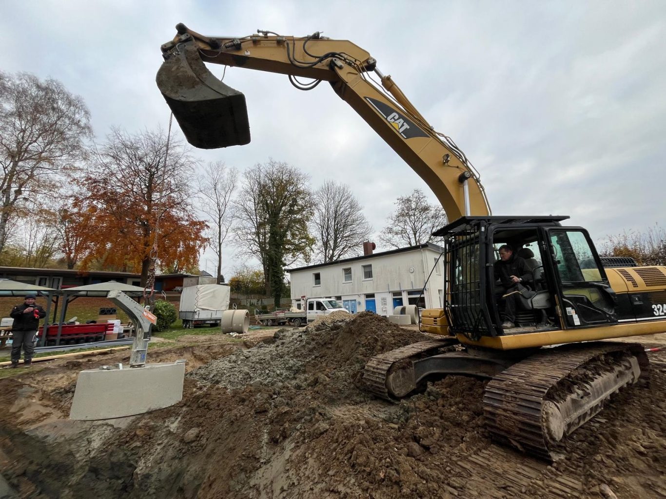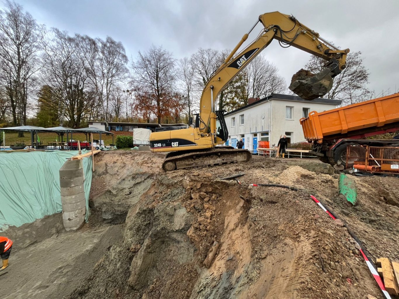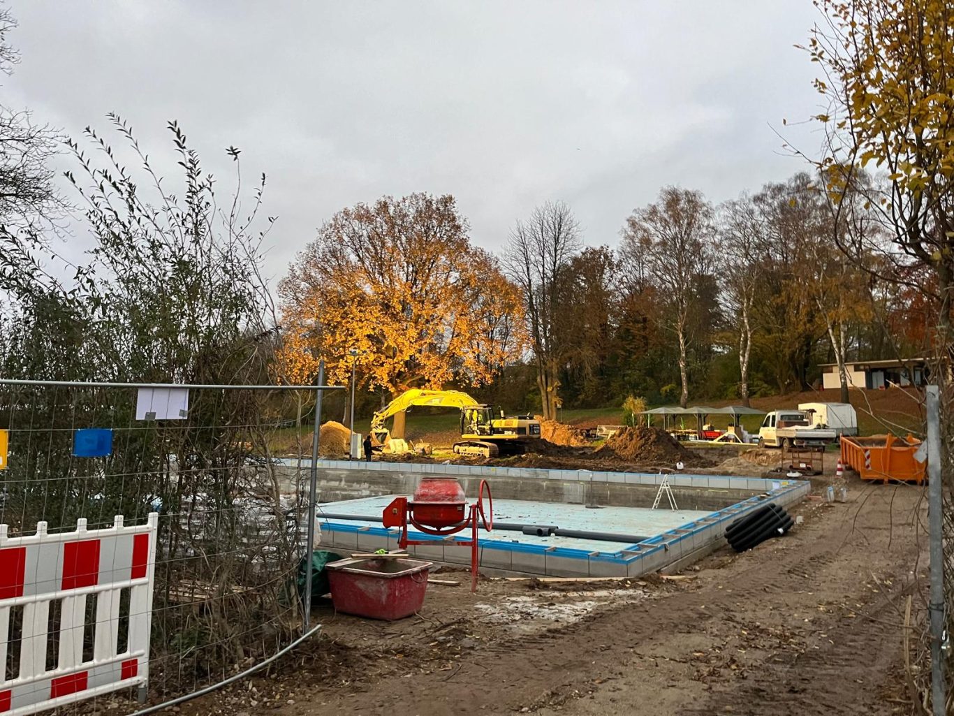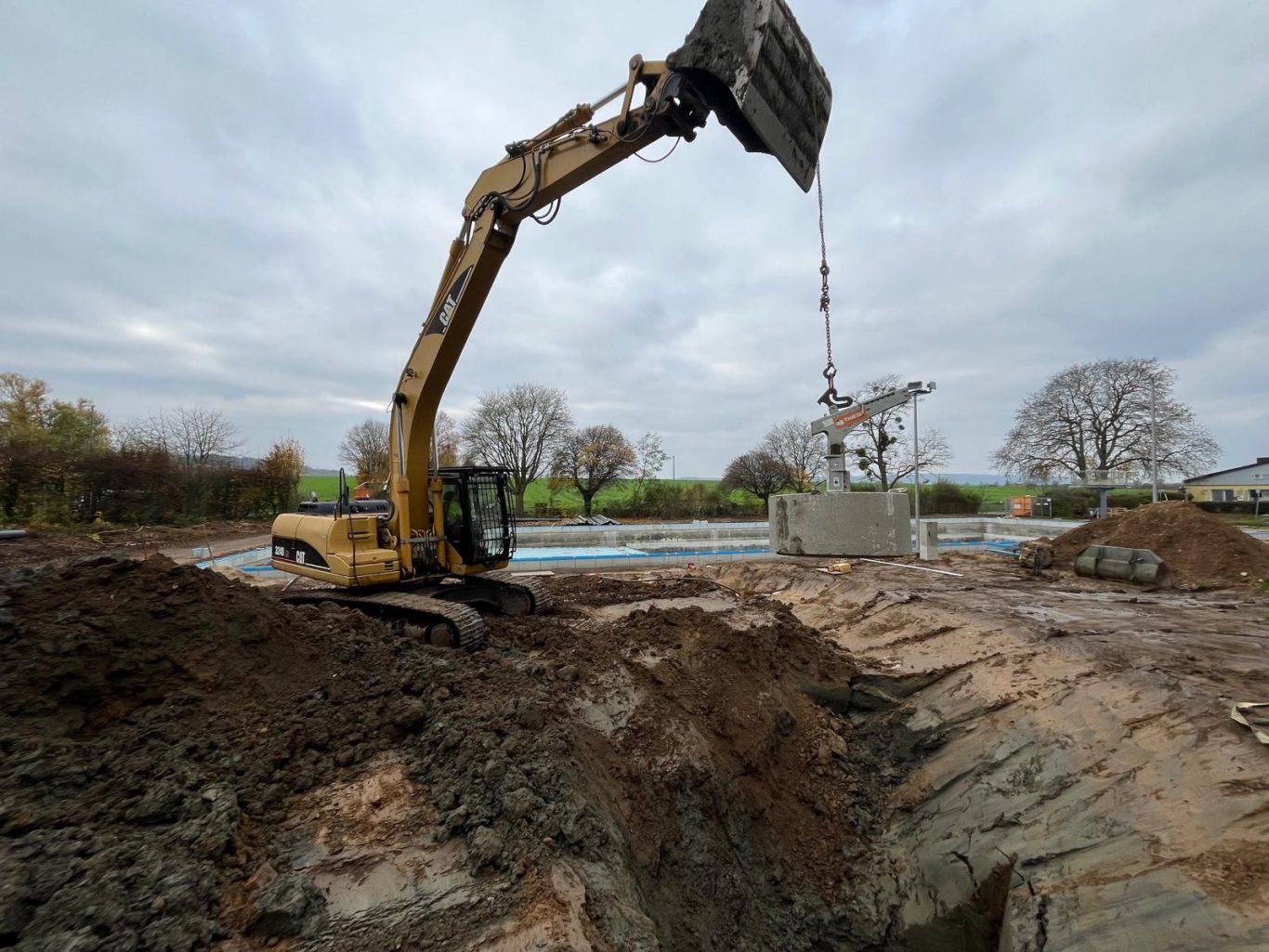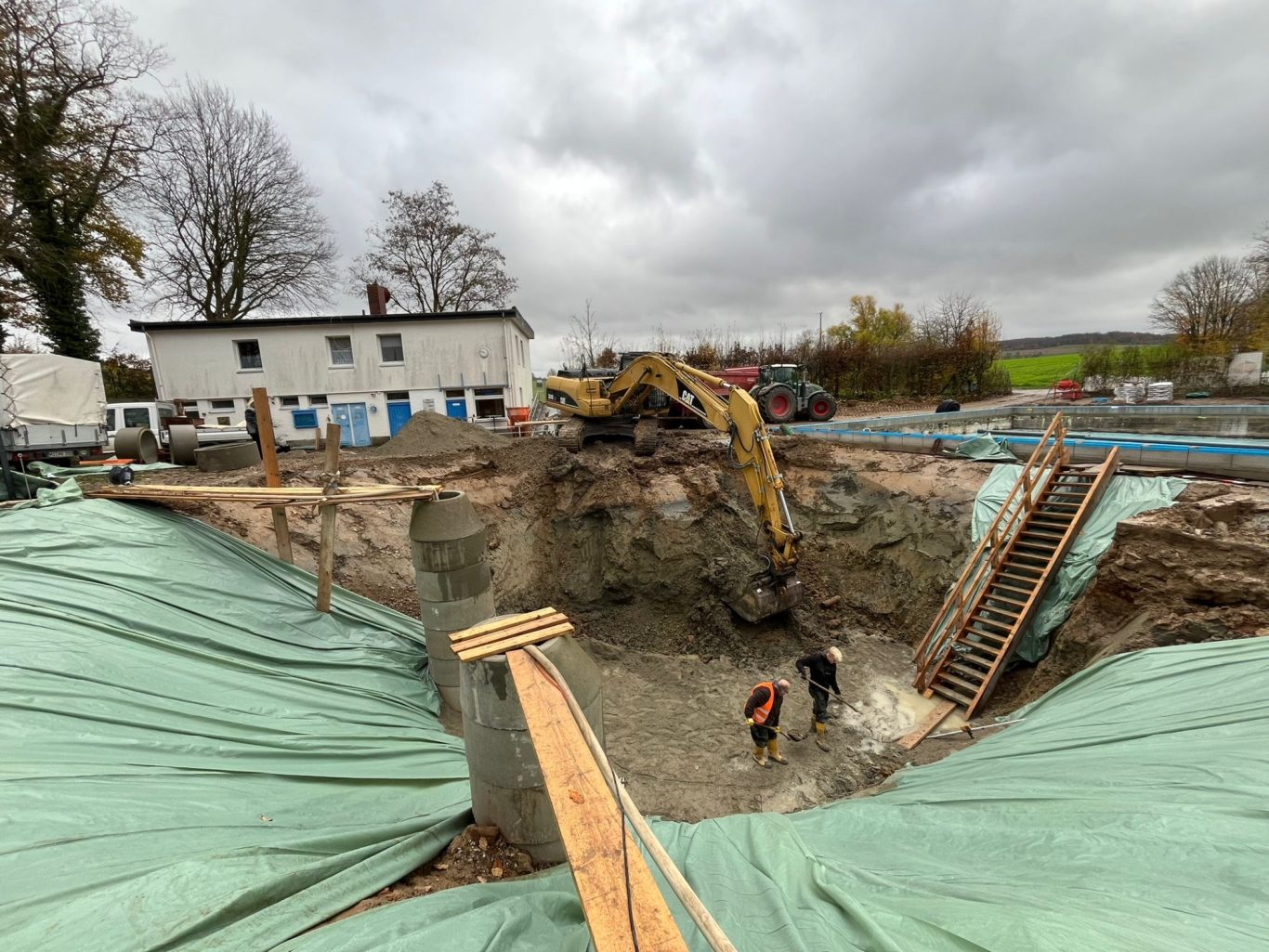 Die Erdarbeiten sind schon fast fertig und die Schächte zur Grundwasserabsenkung sind gesetzt.