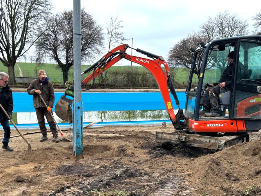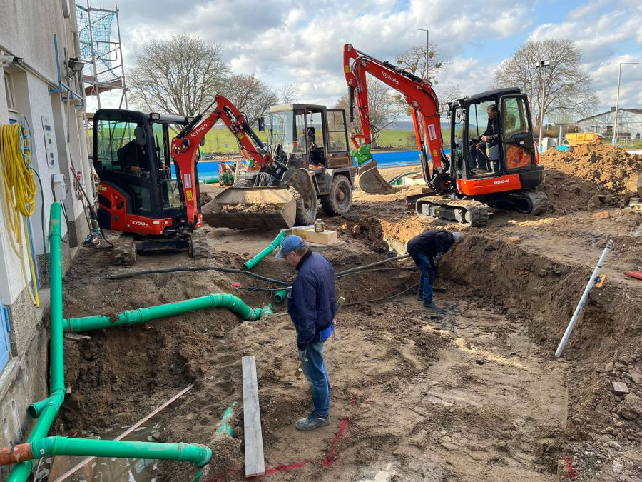 Der harte Kern arbeitet bei jedem Wetter. Die Vorbereitung für die Pflasterarbeiten laufen.